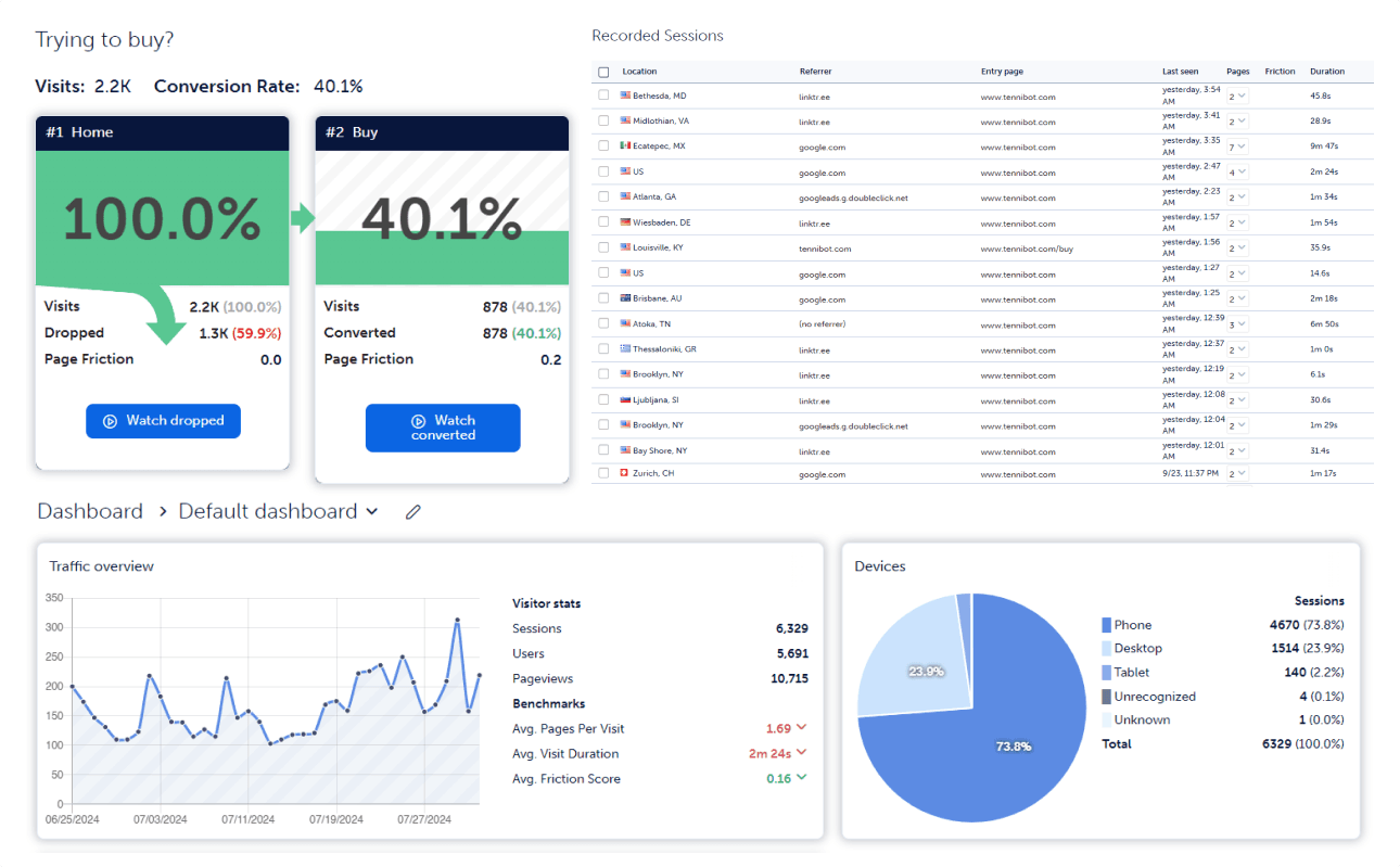 Soon after the site changes went live, I began researching our visitors behavior using an analytics tool called Mouseflow. This allowed me to check scroll behavior, session length, and watch recorded sessions for more in depth feedback. I learned that users were going to the purchase flow too quickly, and missing crucial information. The average scroll rate of the landing page was only 32%, meaning that users did not grasp the value proposition. To combat this, I redesigned the Buy and Home pages to encourage users to view the important information before beginning the checkout process.